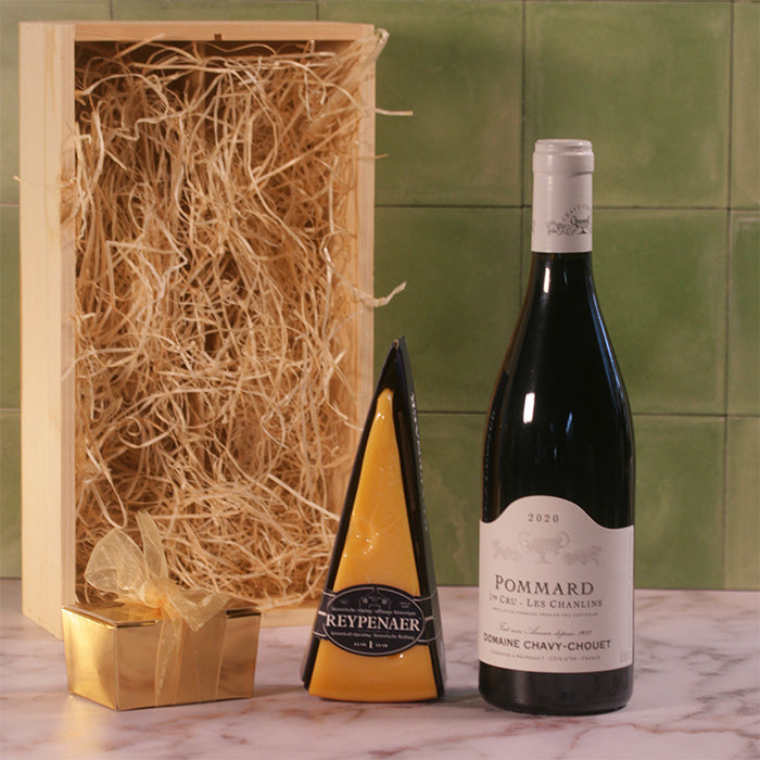 Een wijngeschenk met een prachtige rode wijn. Er zit een gouden doosje bij met 125 gram ambachtelijk gemaakte Belgische bonbons en een stuk oude kaas van 325 gram. Het geschenk wordt geleverd in een luxe houten kist met schuifdeksel.