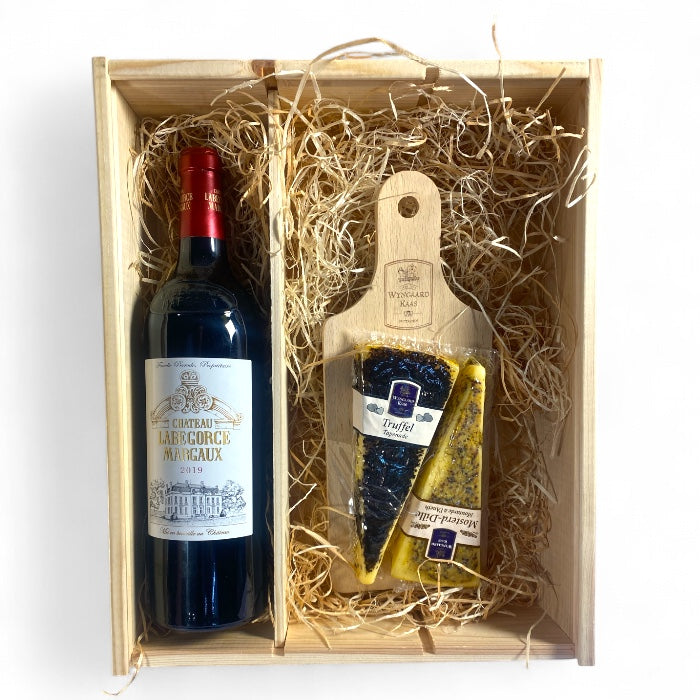 Looking for a stylish cheese and wine gift? This exclusive gift set combines top quality with taste and presentation. In a luxurious wooden gift box you will find an elegant bottle of Château Labegorce Margaux 2019, together with a Wyngaard cheese duo on a wooden serving board.